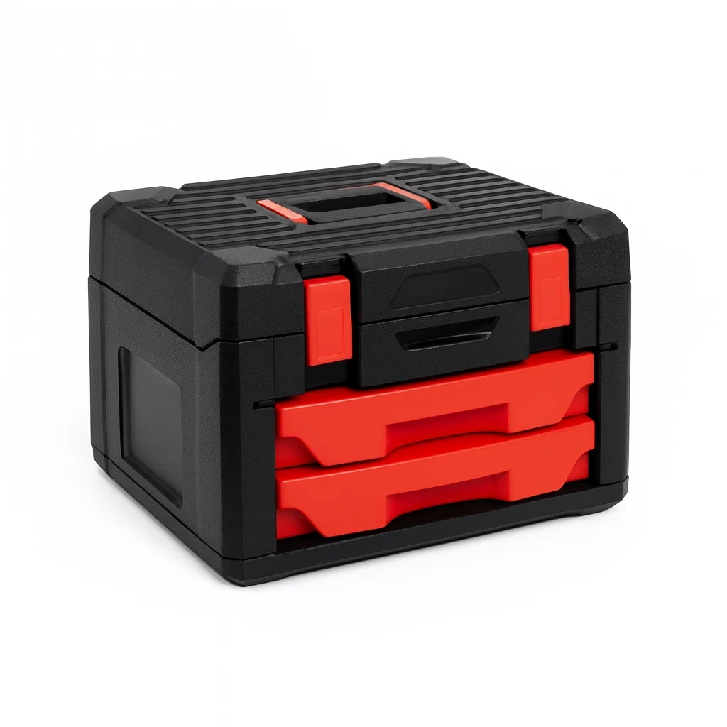 Cassetta degli attrezzi in polipropilene con cassetti neri e rossi